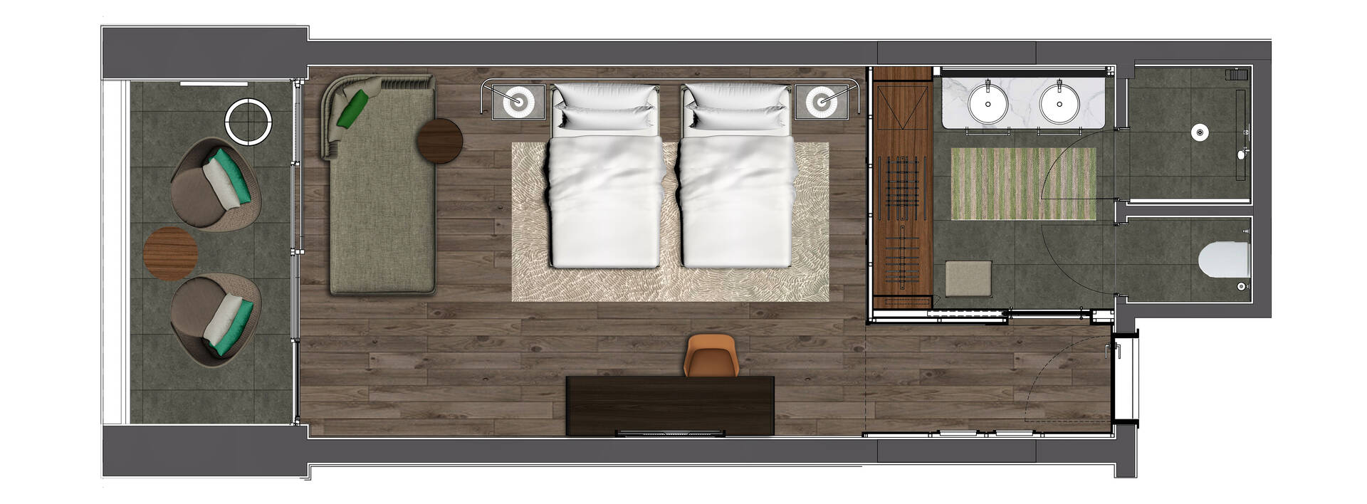 - 2 single beds or 1 king size bed