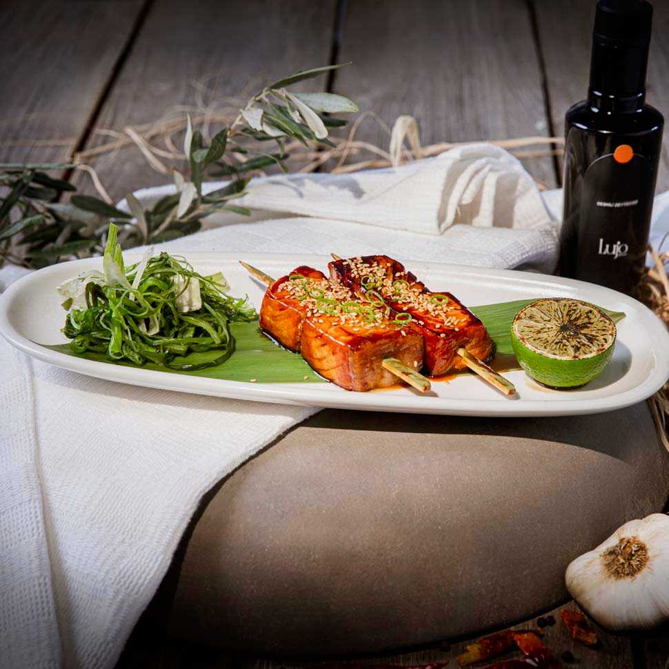 Offering a unique flavor that leaves an unforgettable taste on the palate, this exquisite dish features salmon marinated in teriyaki sauce and slow-cooked, enriched with fennel, seaweed salad, and roasted sesame.
