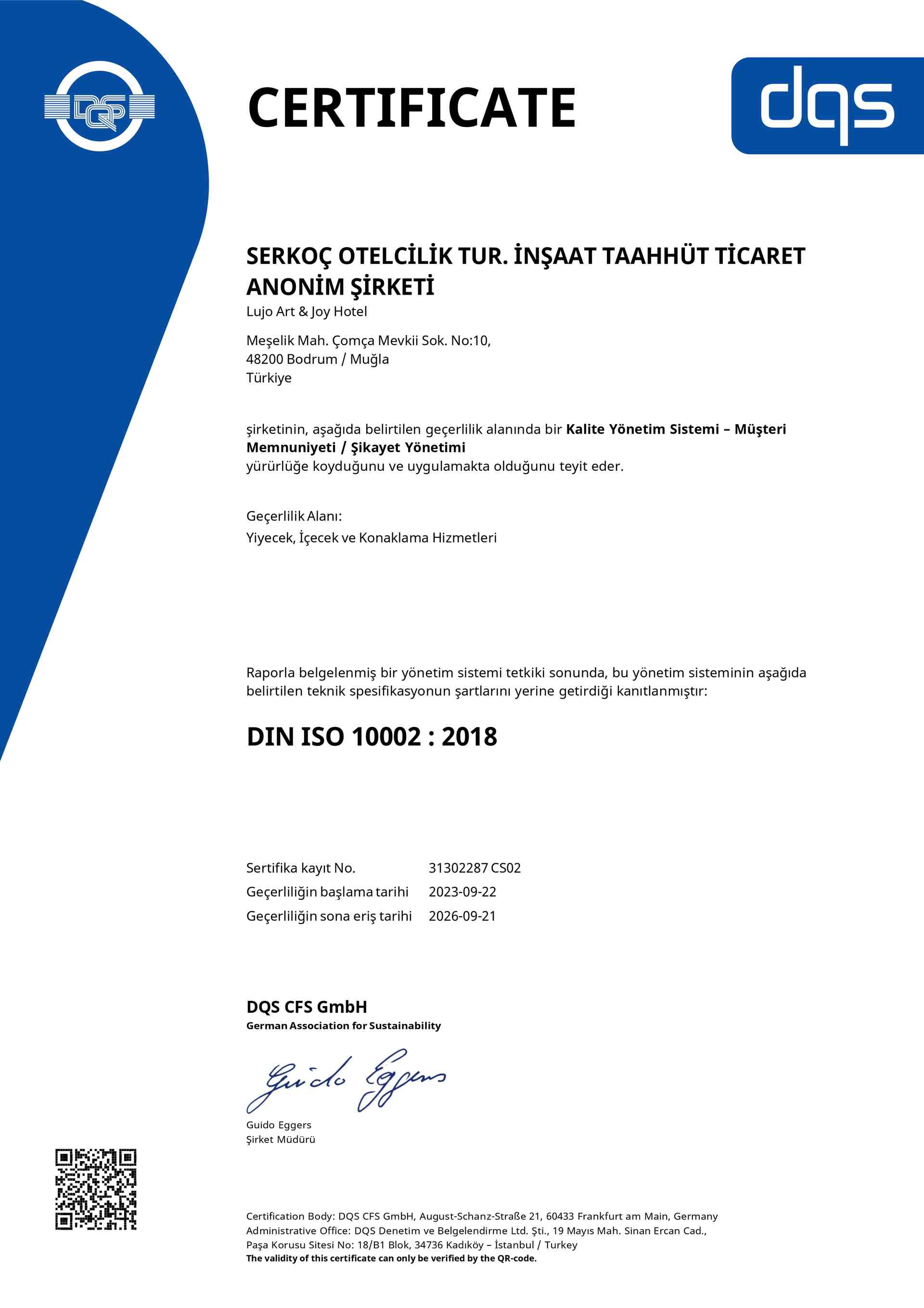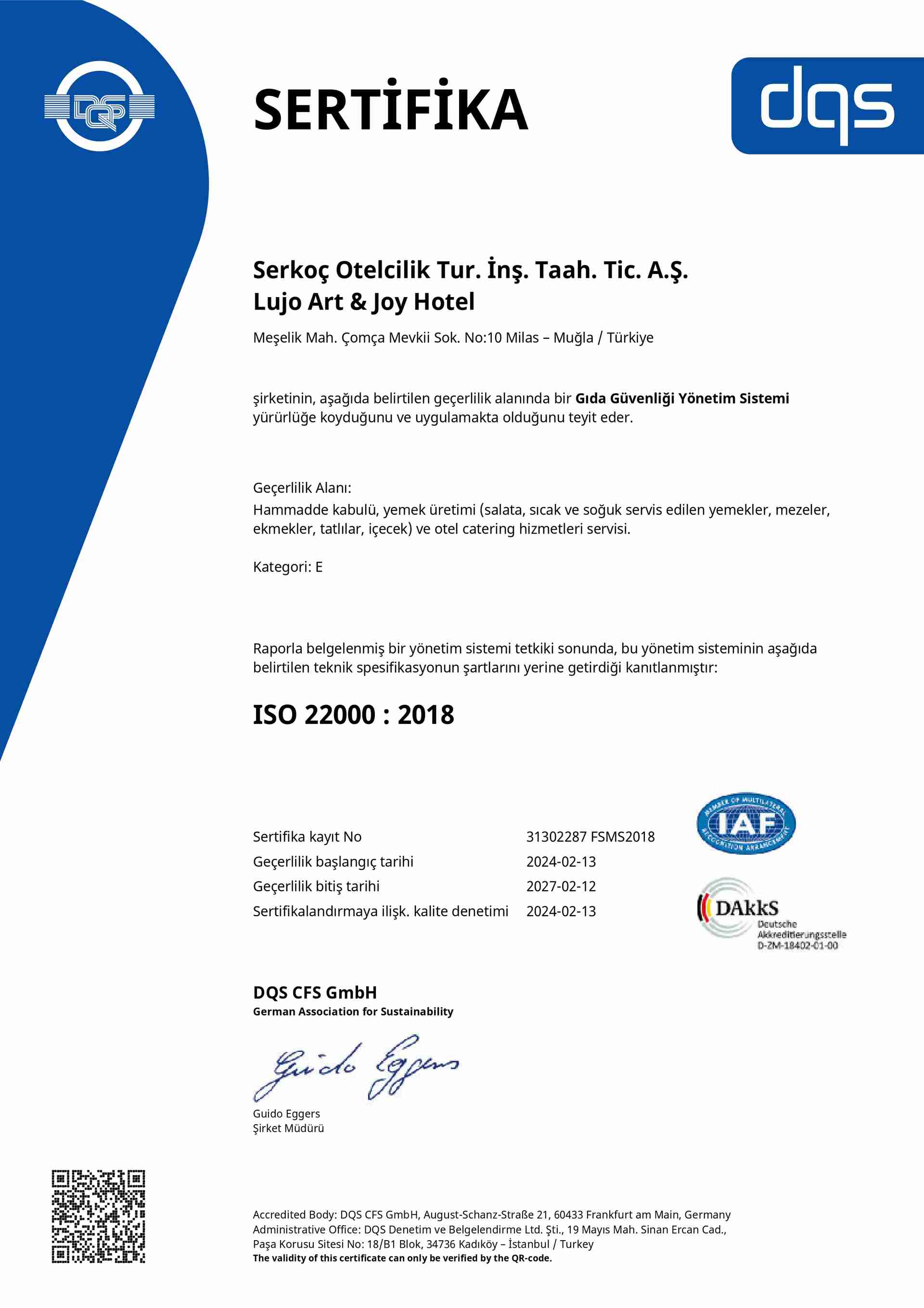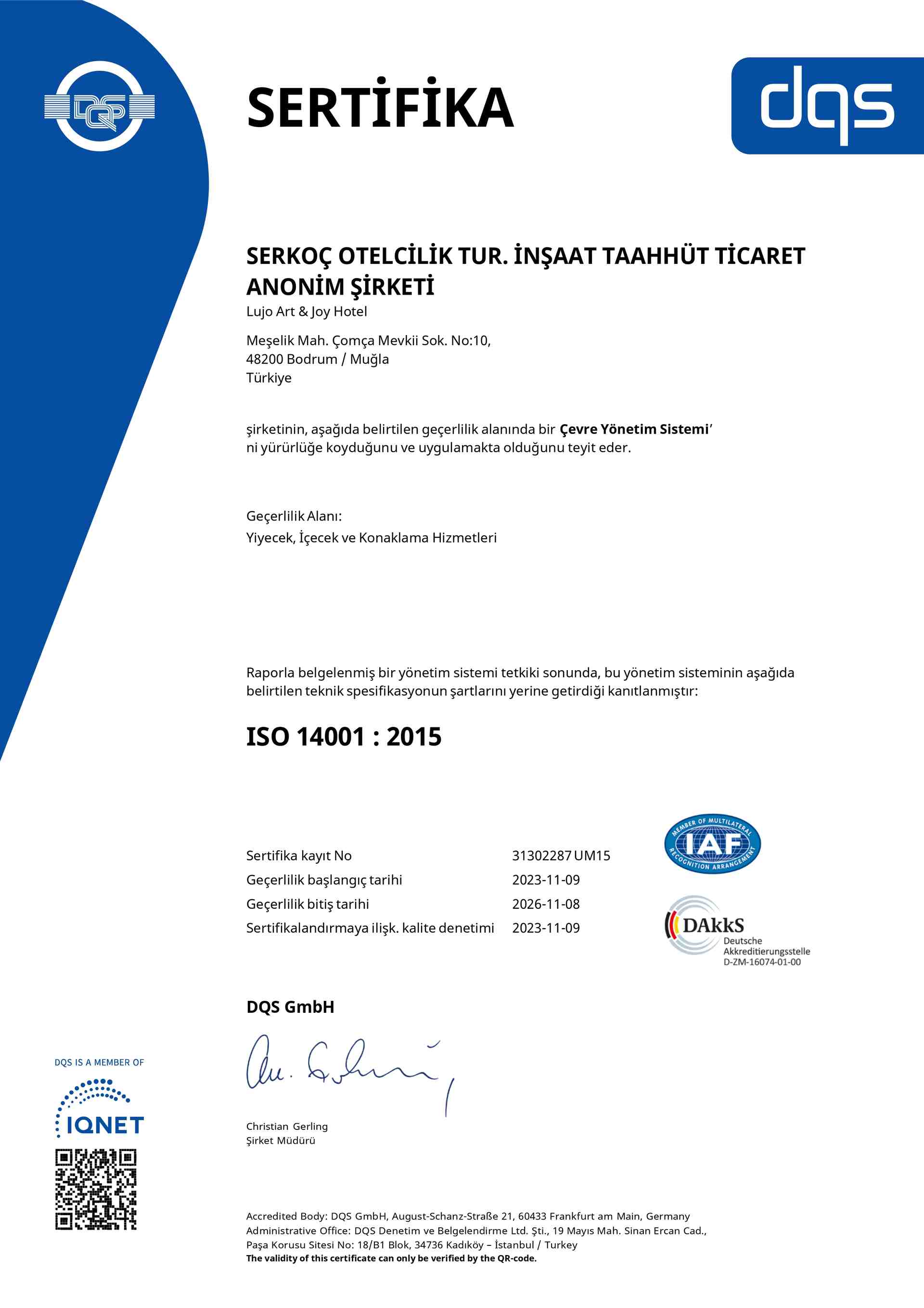Lujo Hotel olarak, kaliteli hizmet sunma misyonumuz doğrultusunda ISO belgelerimizle çevre yönetimi, sağlık ve güvenlik yönetimi, müşteri memnuniyeti gibi standartlarda yüksek kaliteyi taahhüt ediyoruz. ISO belgelerimizle, misafirlerimizin her ziyaretlerinde güvenle aynı kaliteyi bulmalarını sağlıyoruz.